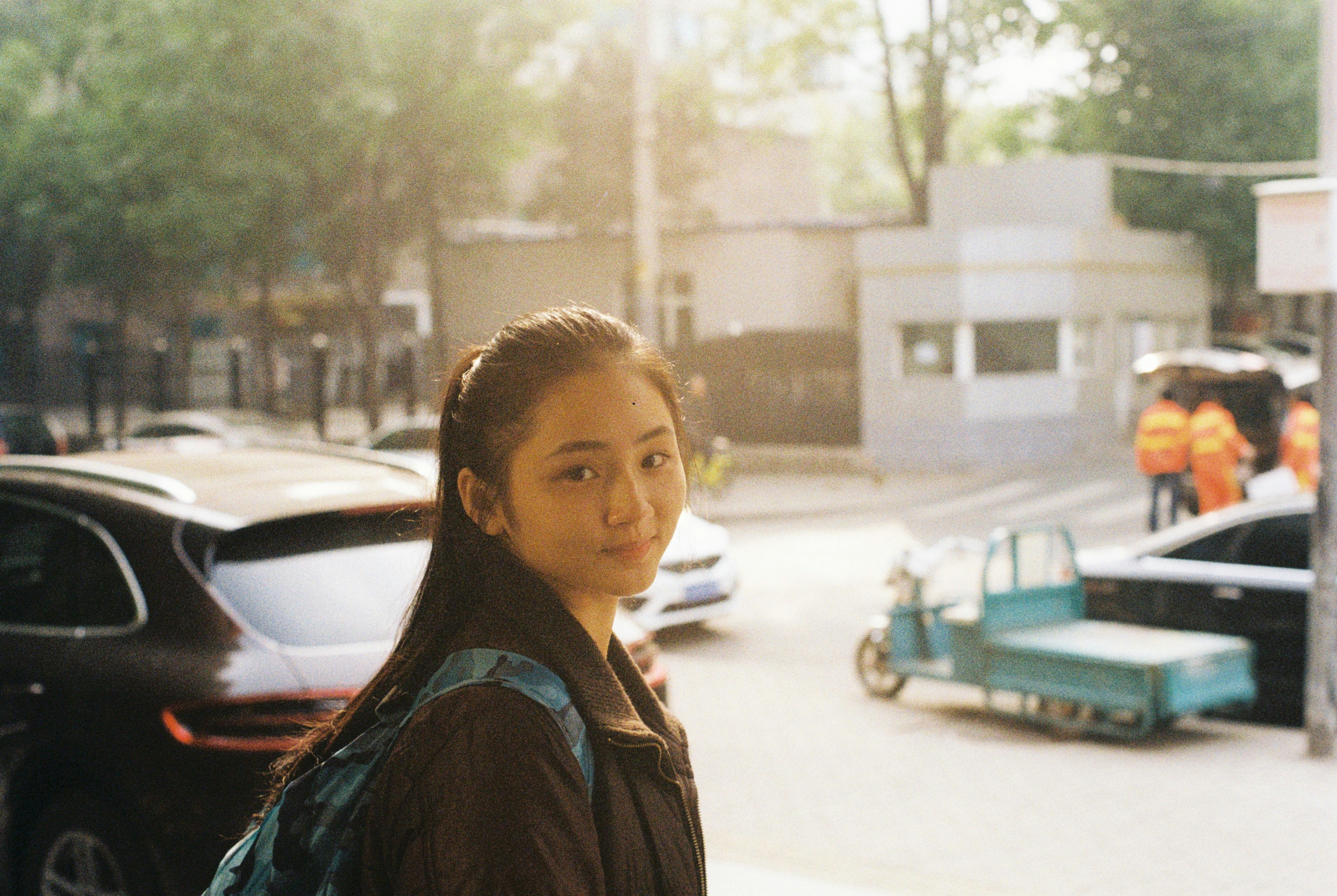 Young woman with dark hair in casual attire smiling outdoors with city background