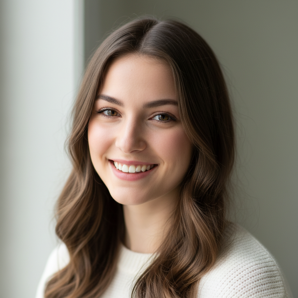 Professional woman with long brown hair wearing white blazer smiling at camera
